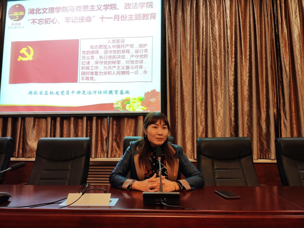 参观完毕,全体教师在尧治河村委会五楼会议室开展十一月“不忘初心、牢记使命”主题教育。在座的各位老师齐唱国歌,党员们重温入党誓词,集体观看了尧治河专题片《高山云端幸福村》,尧治河村支部委员章治兰为在座的老师讲授党课,她介绍了尧治河村党员干部勇于发挥“敢于吃苦、善于吃亏”的先锋模范作用,带领全村群众战天斗地、摆脱贫困的创业致富历程;介绍了在新时代背景下,尧治河村突破发展瓶颈,走上转型发展、绿色发展、共享发展道路的崭新历程。生动的语言、不朽的精神、感人的事迹,赢得了大家阵阵掌声,同志们在思想上再次接受洗礼,个人的灵魂再次得到净化,境界再次得到提升,信念再次得到坚定。党支部书记谢正富、张维功作了代表发言。