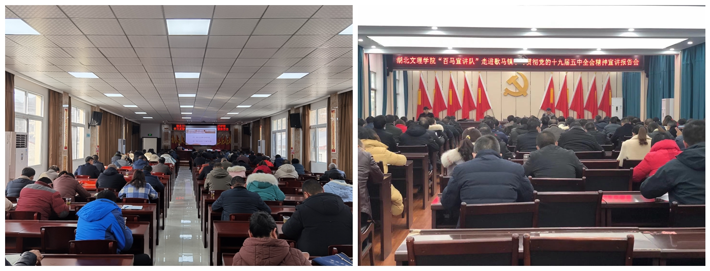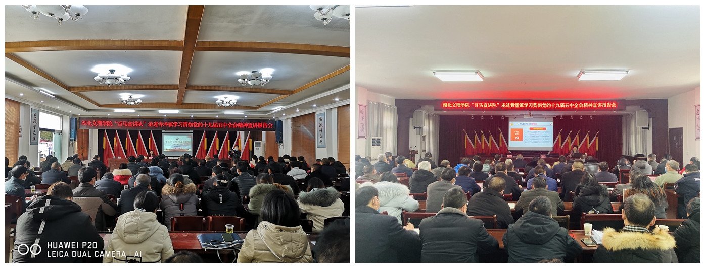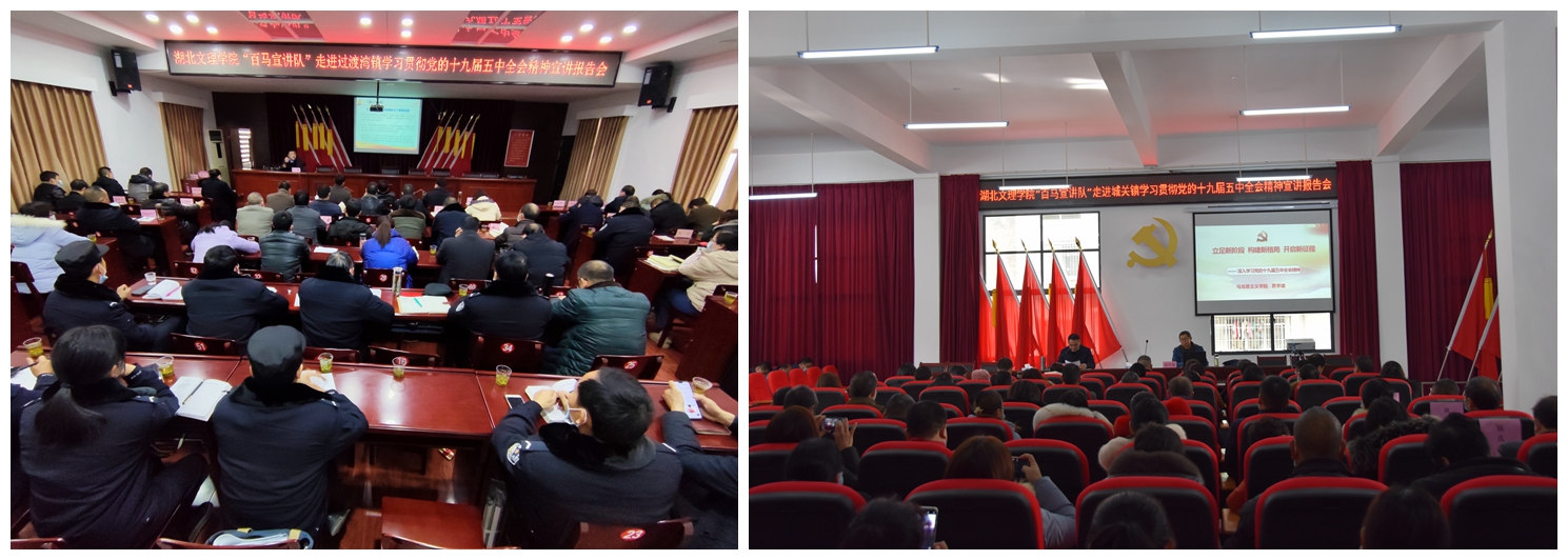 宣讲小分队成员王奎教授、詹学德教授、朱海波教授、周淑芳副教授、熊明秀副教授和陈善友博士分赴保康县过渡湾镇、城关镇、后坪镇、黄堡镇、寺坪镇和歇马镇等6个乡镇新时代文明实践所宣讲党的十九届五中全会精神。