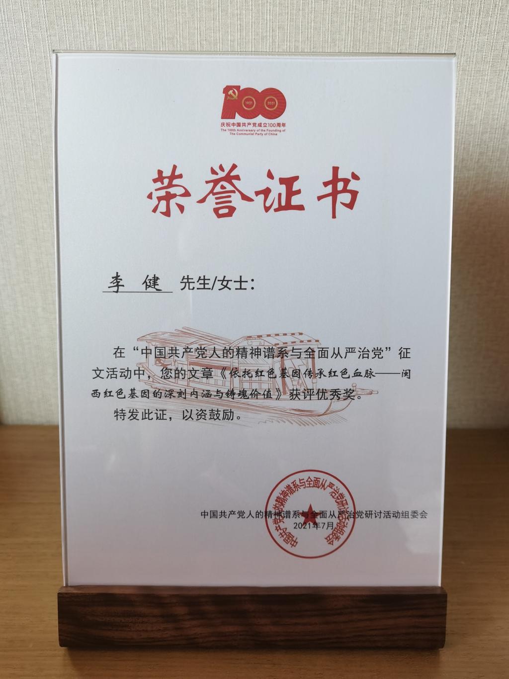 李健老师提交的论文《依托红色基因传承红色血脉——闽西红色基因的深刻内涵与铸魂价值》获得了评审专家的一致好评。李健老师作为全国四个获奖代表之一受邀参会,并被相关领导颁发了荣誉证书。