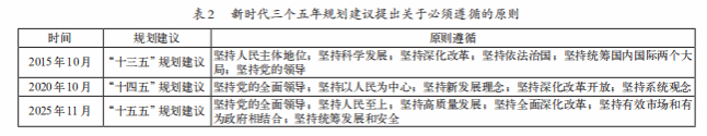 党中央提出必须遵循的重大原则基于三个方面的考量:一是运用好成功经验,二是把握好发展要求,三是定准好实践指向。明确必须遵循的原则,对全党全国各族人民统一思想、意志、行动具有十分重要的意义。进入新时代以来,党中央提出的三个五年规划建议都对必须遵循的原则作出了明确规定(见表2)。“十三五”规划建议提出“六个坚持”的原则,“十四五”规划建议提出“五个坚持”的原则,“十五五”规划建议提出“六个坚持”的原则,从这些原则看,既有保持不变的规定,又有新要求的规定。不变的规定体现战略定力,新的规定体现策略要求。