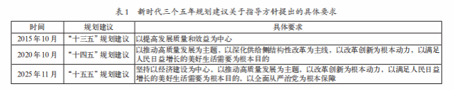 从新时代三个五年规划建议看,党中央明确指导方针包含两个方面的内容:一是指导思想,二是具体要求。关于指导思想,以坚持守正创新为原则,在把马克思列宁主义作为立党立国、兴党兴国的根本指导思想的同时,明确对马克思主义中国化时代化历史实践中结出的毛泽东思想、邓小平理论、“三个代表”重要思想、科学发展观等理论创新成果的坚持,突出当代中国马克思主义、21世纪马克思主义的指导意义。“十三五”规划建议强调“深入贯彻习近平总书记系列重要讲话精神”,“十四五”规划建议强调坚持“以习近平新时代中国特色社会主义思想为指导”,“十五五”规划建议强调“全面贯彻习近平新时代中国特色社会主义思想”。关于具体要求,以坚持与时俱进为原则,新时代三个五年规划建议分别用“以……”的表述加以揭示(见表1),体现了坚持指导思想与规定具体要求相统一。从“十三五”规划建议 “一个以”到“十五五”规划建议“五个以”的发展,既突出了以阶段性重点聚焦形成的具体要求,又显示了以“高质量发展”、“改革创新”、“满足人民日益增长的美好生活需要”的发展逻辑。“十五五”规划提出的“五个以”,围绕“中心”、“主题”、“动力”、“目的”、“保障”的系统架构提出具体要求,为推动国民经济和社会发展提供了指导实践的整体方略。